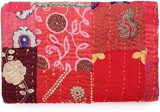 Sophia-Art インド製 ハンドメイド ベッドパトラ シルク パッチワーク カンタキルト カンタブランケット ベッドスプレッド パッチ カンタスロー キングカンタ、カンタラリー、インディアンサリーキルト サイズ90インチ x 108インチ