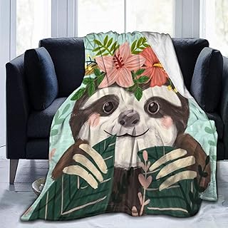 SARA NELL かわいいナマケモノフランネルフリースブランケット 花柄と緑の葉 スローブランケット 面白いアニマルプリント ソフトで暖かい肌触りの良いフラシ天ブランケット ベッド/ソファ/女の子/男の子向け 60x80インチ