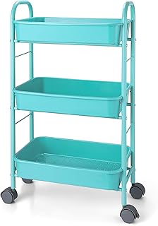 Simple Trending 3段メタルローリングストレージカート ユーティリティオーガナイザーカートストレージシェルフ プラスチックバスケット付き 2つのロック可能なホイール付き キッチン バスルーム用 ブルー