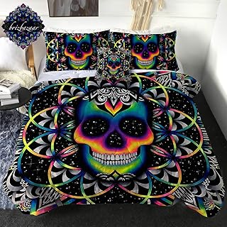 Erosebridal スカル寝具セット ツインサイズ シュガースカル 掛け布団 カバー スカル ファイヤー 掛け布団カバー キッズ ボーイズ ユース ゴシック スケルトン レッドフレーム ベッドカバー 枕カバー1枚付き 寝室装飾