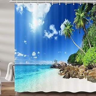 オーシャンビーチシャワーカーテン 浴室用 ブルートロピカルシーパームツリー ファブリックシャワーカーテンセット 夏の海辺風景 バスルームアクセサリー 装飾 フック付き (幅69 x 高さ72 )