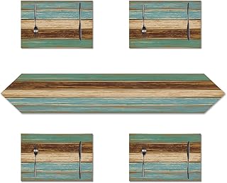 レトロ ラスティック ティール グリーン ブラウン ウッド テクスチャ レトロ ラスティック ティール グリーン ブラウン ウッド テクスチャ プレースマット テーブルランナーセット 防水リネンプレースマット テーブルランナー マットセット キッチン ダイニングテーブル用