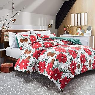 Lifeety 掛け布団3点セット 枕カバー2枚付き クリスマス寝具セット キングサイズ レッドフラワー 松ぼっくり