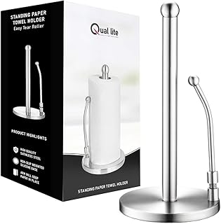 QUAL-LITE ステンレススチール ペーパータオルホルダースタンド – 加重ペーパータオルオーガナイザー テンションアーム付き あらゆるティッシュロールサイズ – モダンなカウンタートップペーパータオルホルダー – 防錆