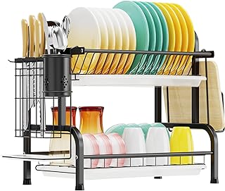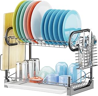 Cambond 食器乾燥ラック 304 ステンレススチール 2段ディッシュラック 排水ボード付き キッチンカウンタートップ用 キッチンカウンタートップ用 ブラック